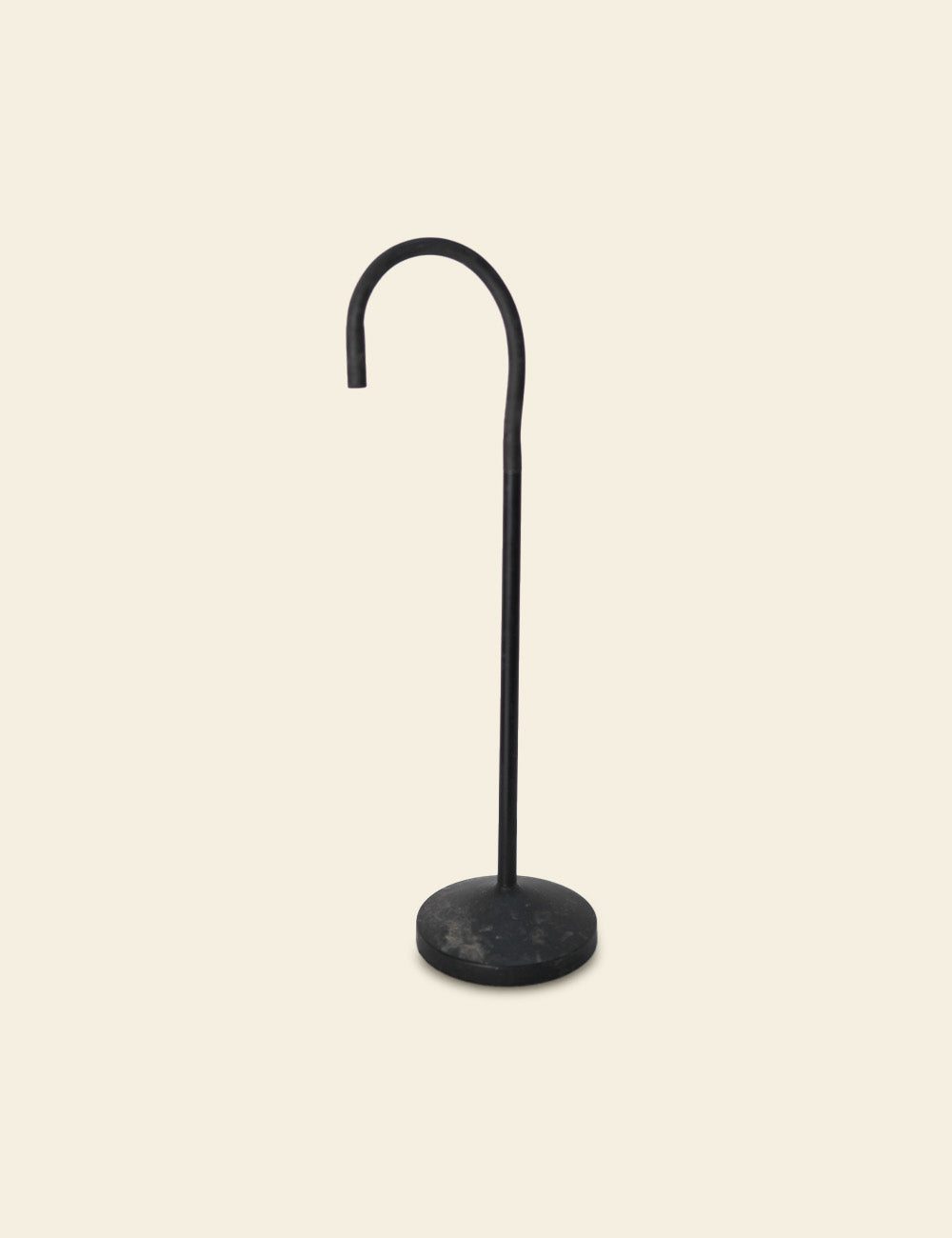 A freestanding floor lamp with industrial matte-black metal finish, ideal for adding vertical drama to indoor or outdoor shoots.