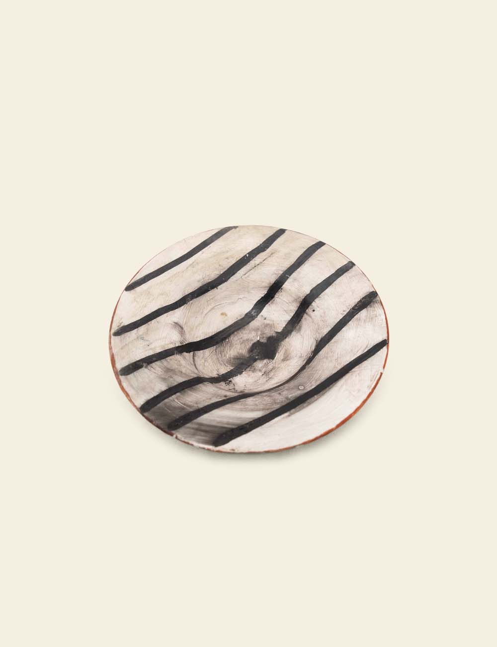 A glazed off-white ceramic pasta bowl with fine black stripes—ideal for minimalist table setups or food flat-lays with a touch of graphic contrast.