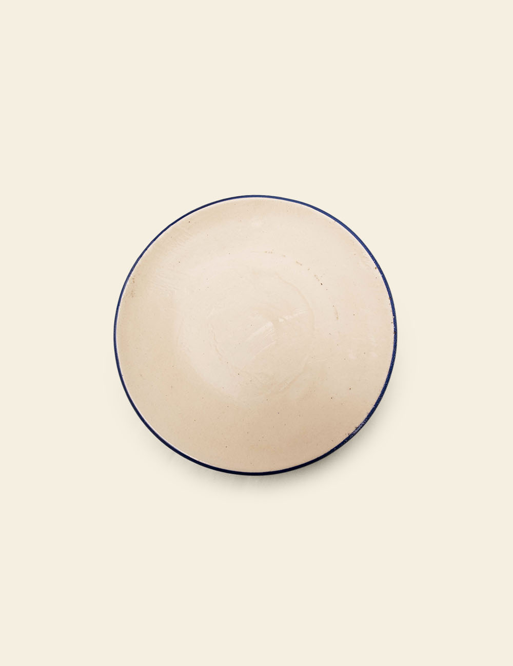 A glazed ceramic plate in off-white with a fine blue rim, offering neutral styling for elevated table settings or minimal food photography.