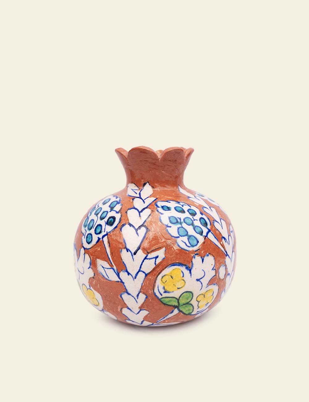 A handcrafted ceramic pomegranate featuring vibrant blue traditional patterns. This symbolic fruit makes a meaningful gift and decorative accent for kitchens, shelves, or cultural art displays.
