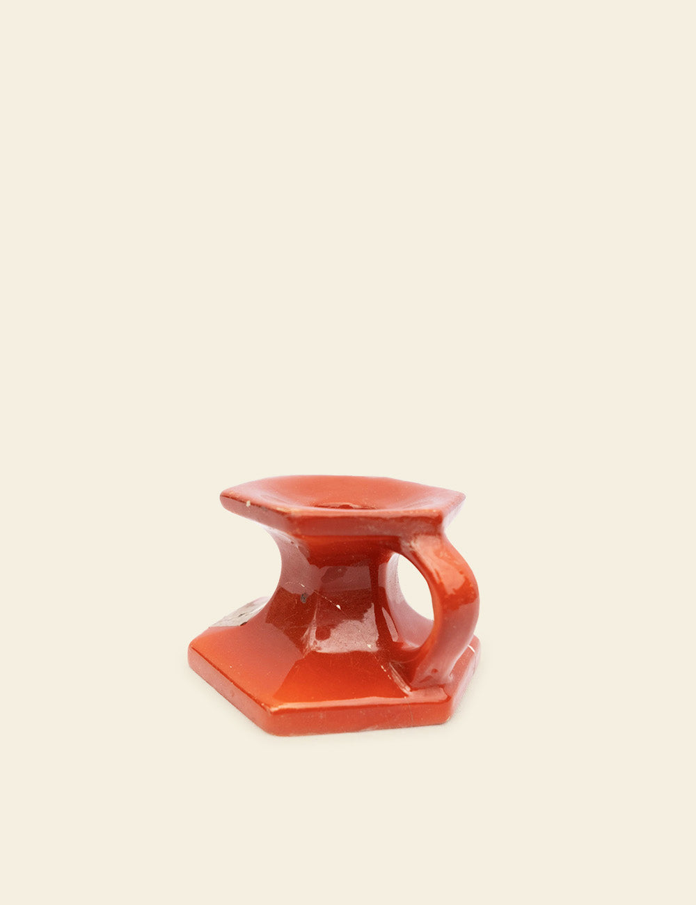 A modern ceramic candlestick with geometric hexagonal form and rich brown glaze, perfect for atmospheric lighting in styled shoots.