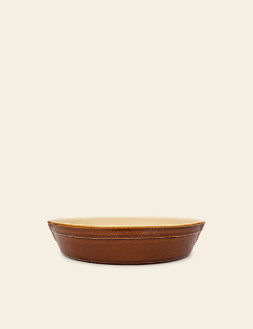 A vintage-inspired brown casserole dish with a matching lid, perfect for oven-to-table serving. The earthy glaze and classic silhouette make it both functional and visually appealing — ideal for styled food shoots or rustic table settings.