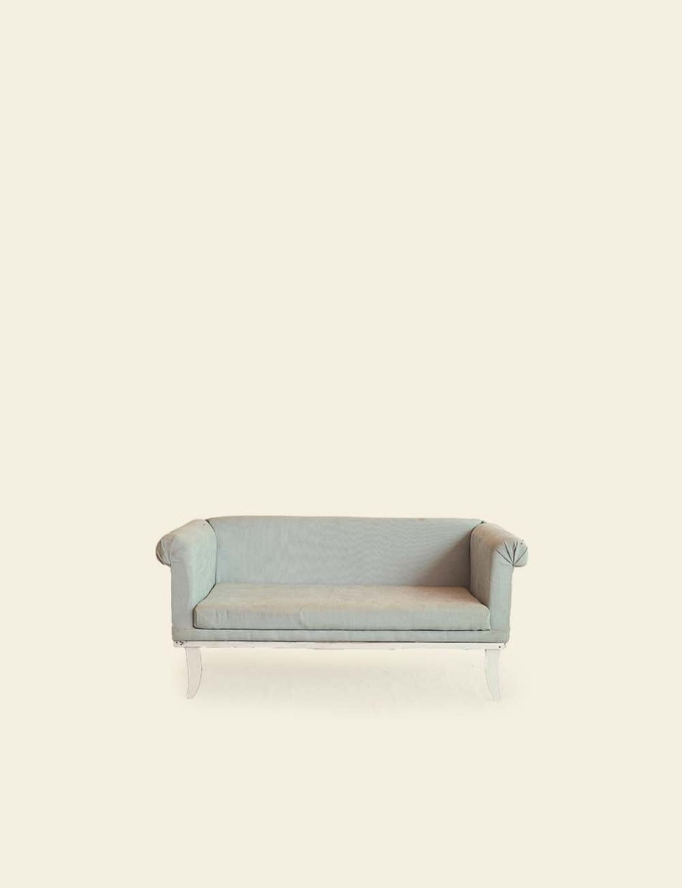 A classic Chester-style sofa in a muted blue-grey tone, featuring tufted upholstery and rolled arms. Ideal for bridal editorials, vintage lounge setups, or refined living room scenes.