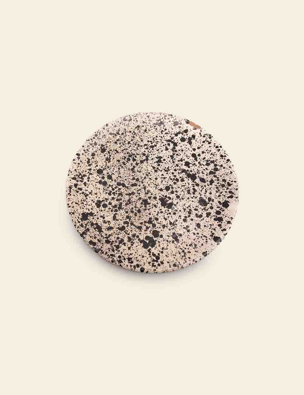A vintage-style plate featuring a speckled confetti brown glaze, inspired by classic Paden pottery. Its warm earthy tones and subtle pattern make it ideal for table styling, food photography, or as a charming decor accent.