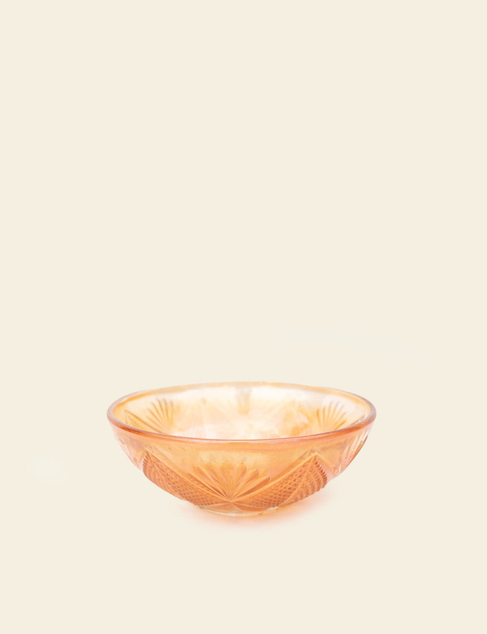 A radiant carnival glass bowl in peach hues with characteristic iridescence, perfect for vintage table settings or as a light-catching decor accent.