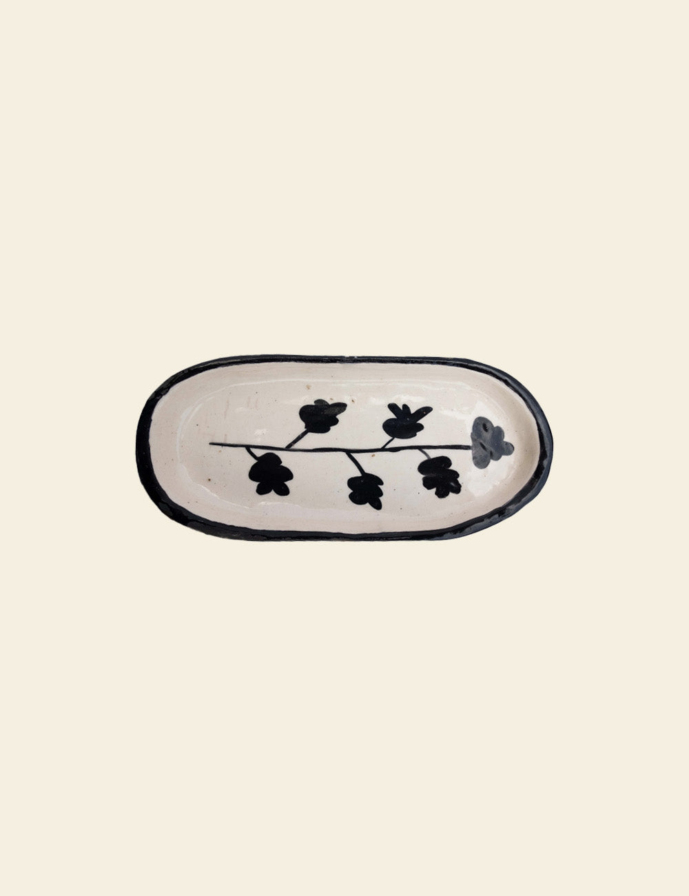 A charming ceramic tray featuring delicate wildflower motifs, perfect for styled tabletops or as a decorative surface for jewelry and small object photography.