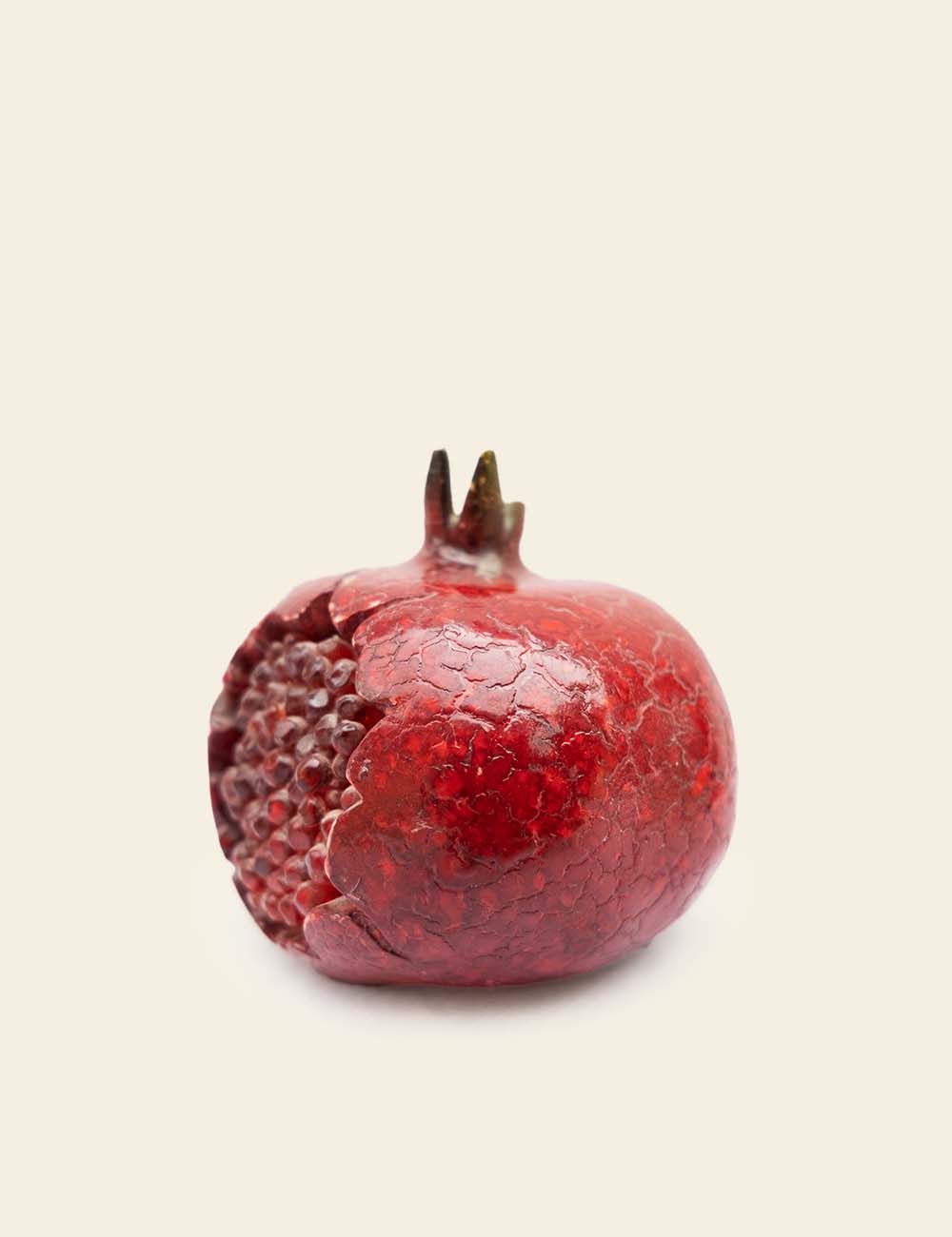 A handcrafted decorative pomegranate designed for art direction and studio styling. Its realistic details add organic texture to tabletop scenes and cultural photoshoots.